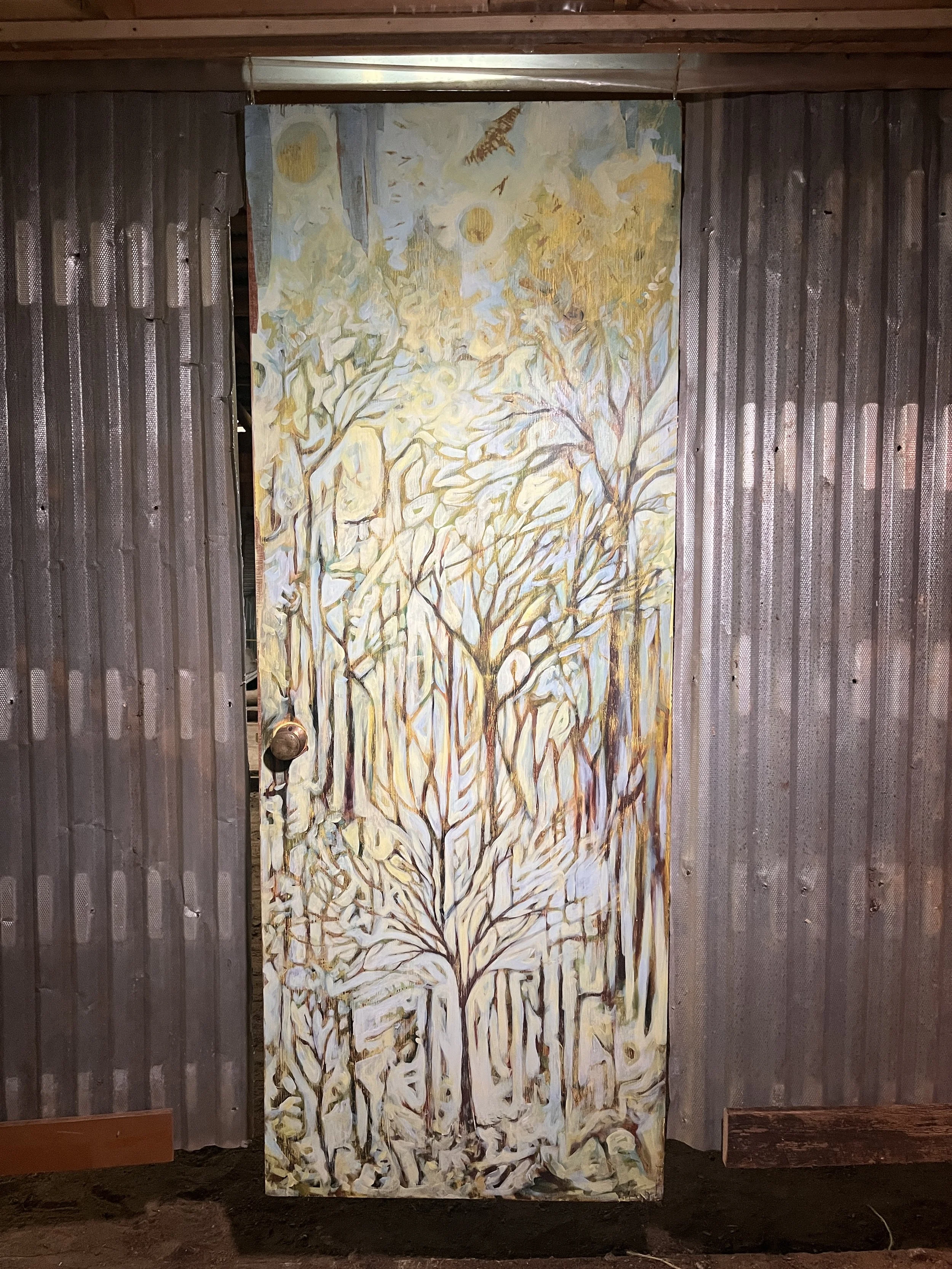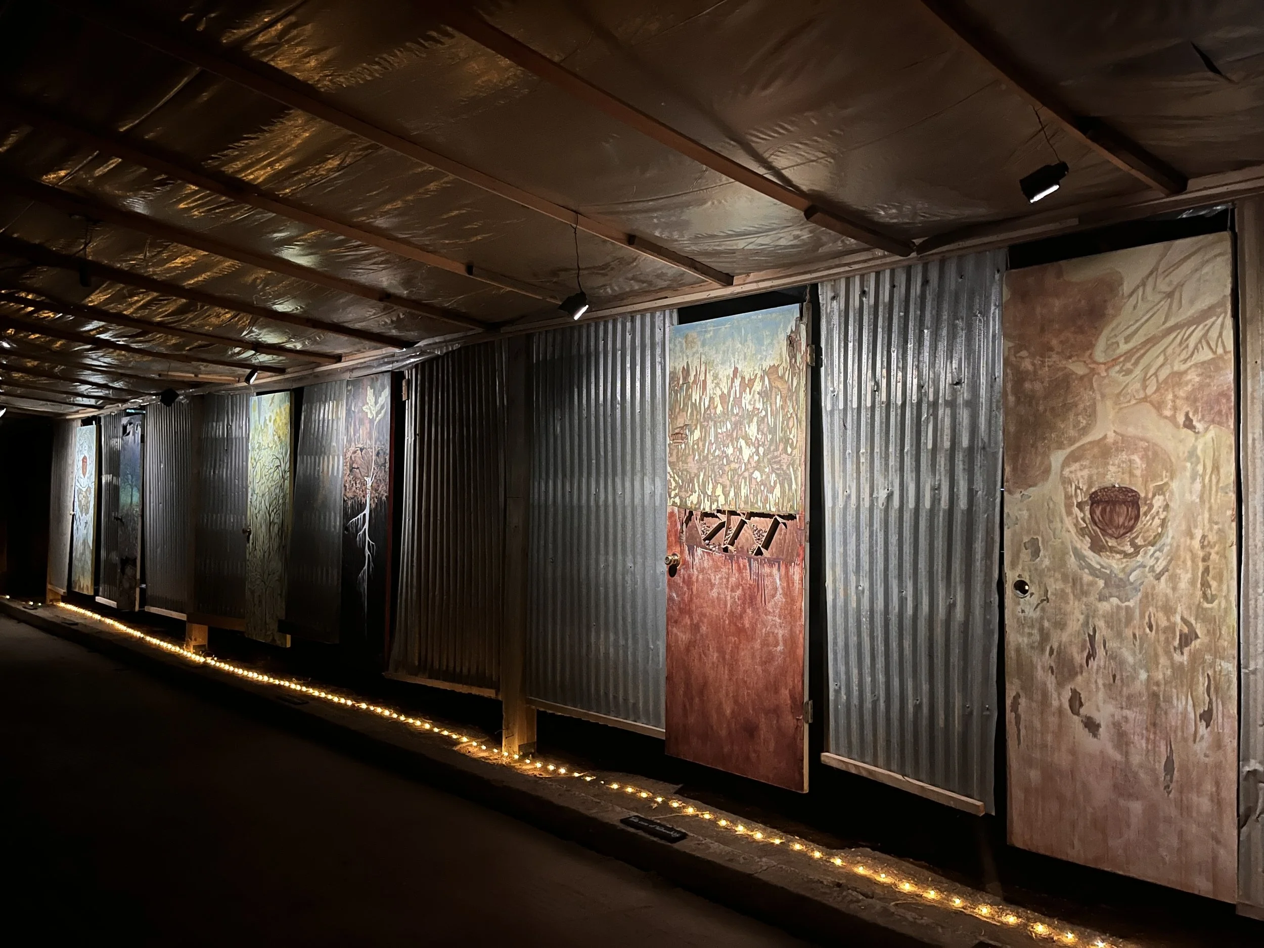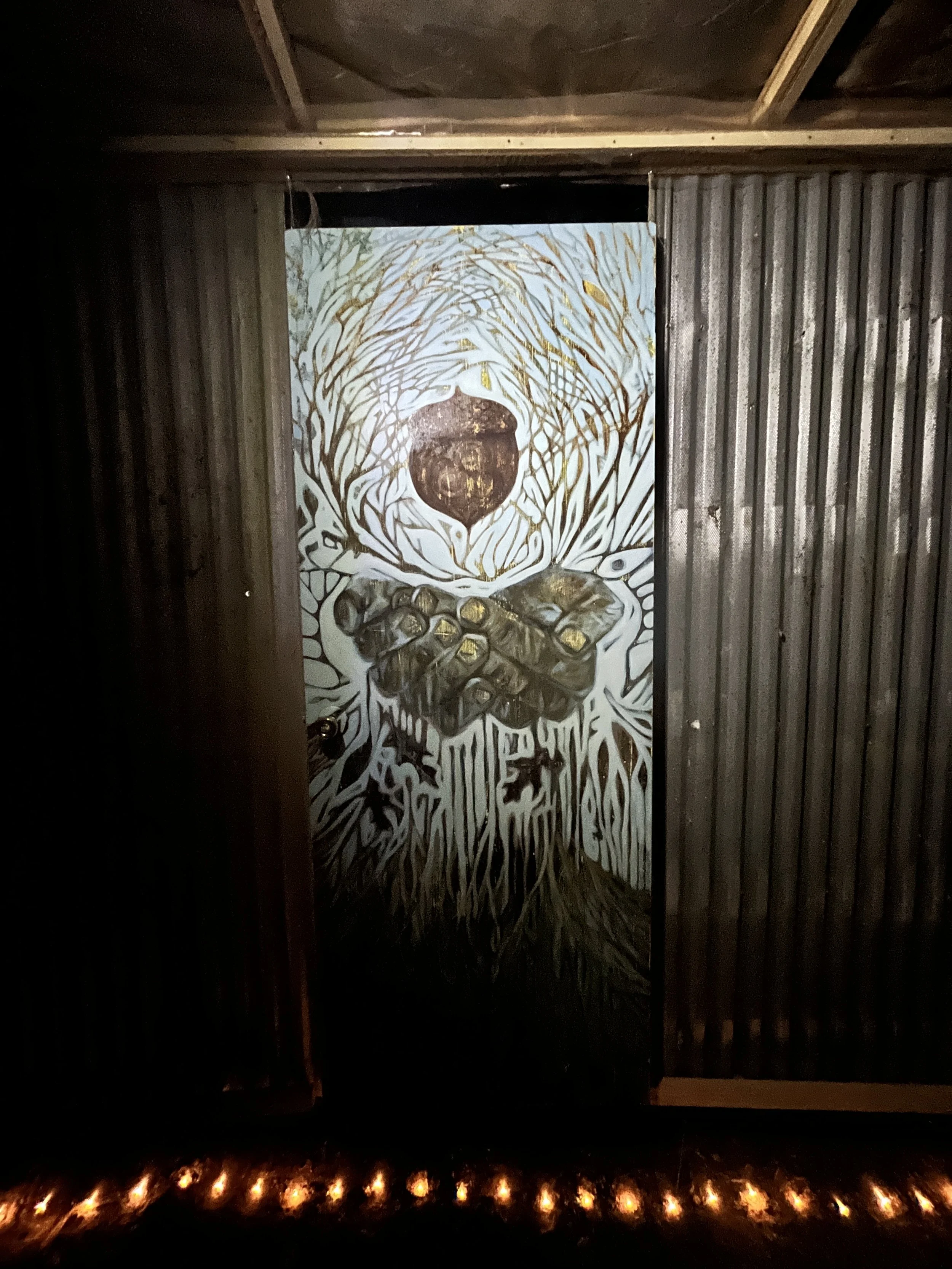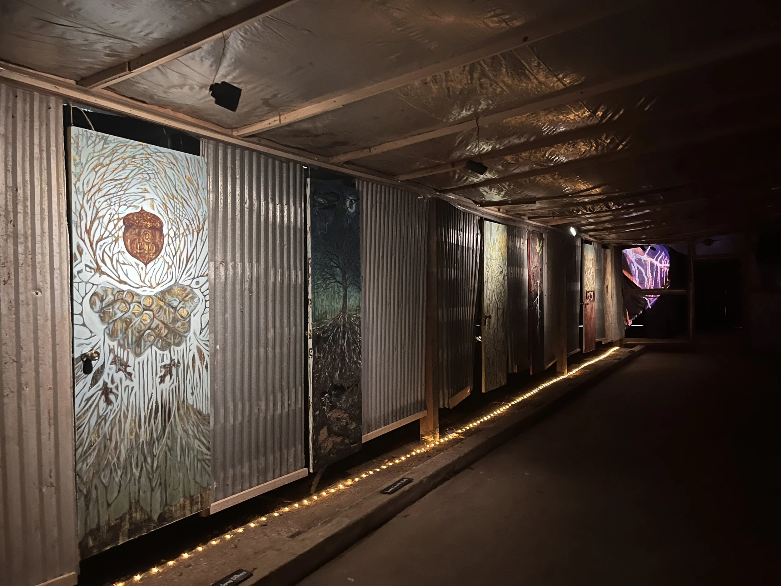 This immersive art experience was curated by local artists and community members, highlighting Sourced Design, the cultural design practiced and shared by Springhouse, an alternative school in Floyd VA. This experience highlights the work of local artist Lore Deighan, who donated her time and experience to create seven works of art with found and donated doors. Springhouse learner Elliot Reilly, apprenticed with local sculptor Charlie Brouwer, and created a large wooden sculpture central to the installation. With projections and lighting lead by DOME, it was a beautiful display of many artistic minds coming together to share these important design principles and values.
